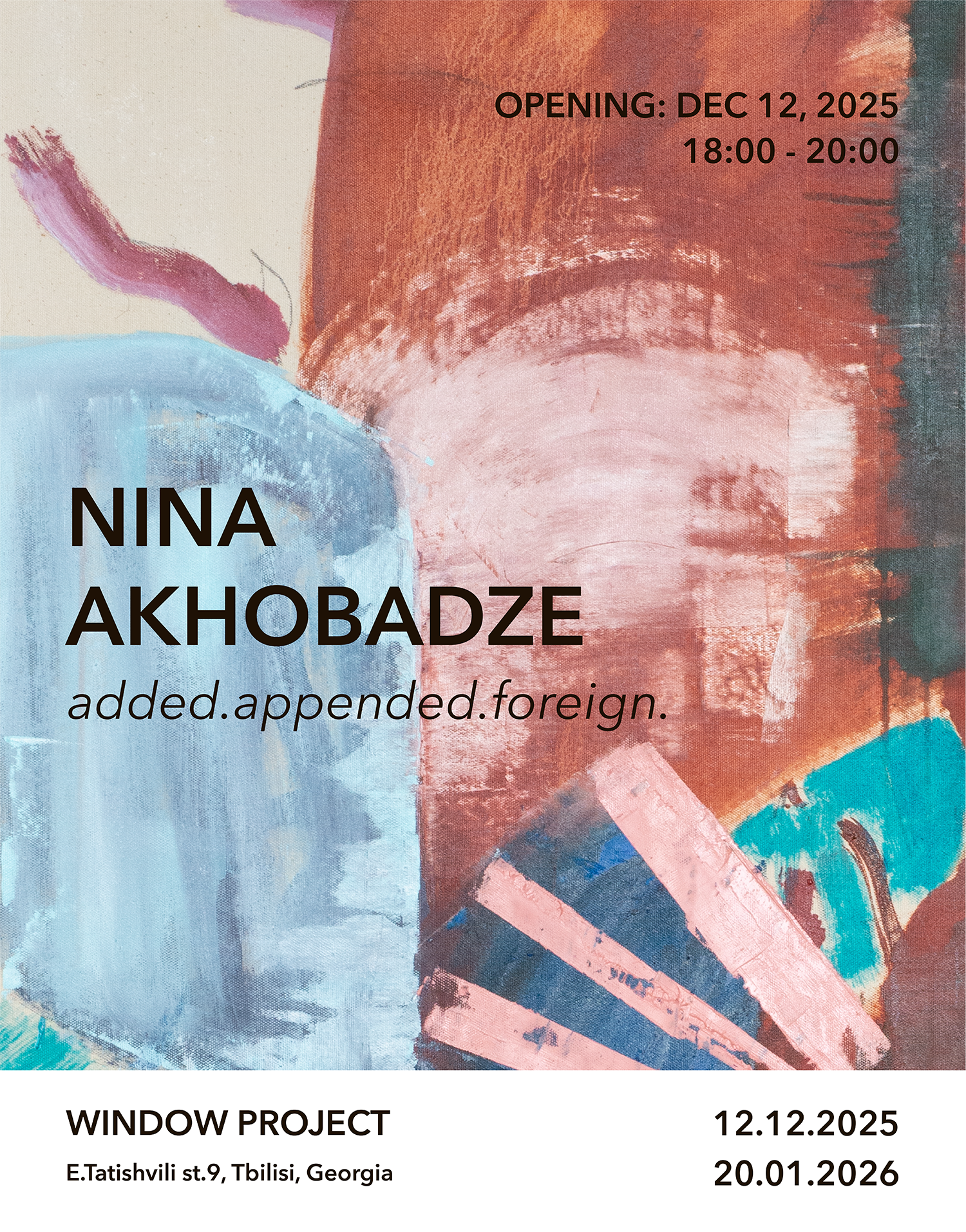 Window Project is pleased to present added.appended.foreign., the first solo exhibition of Nina Akhobadze in Georgia. Bringing together large-scale oil paintings, miniature canvases, and graphic compositions, the exhibition traces Akhobadze’s evolving exploration of abstraction within contemporary painting.