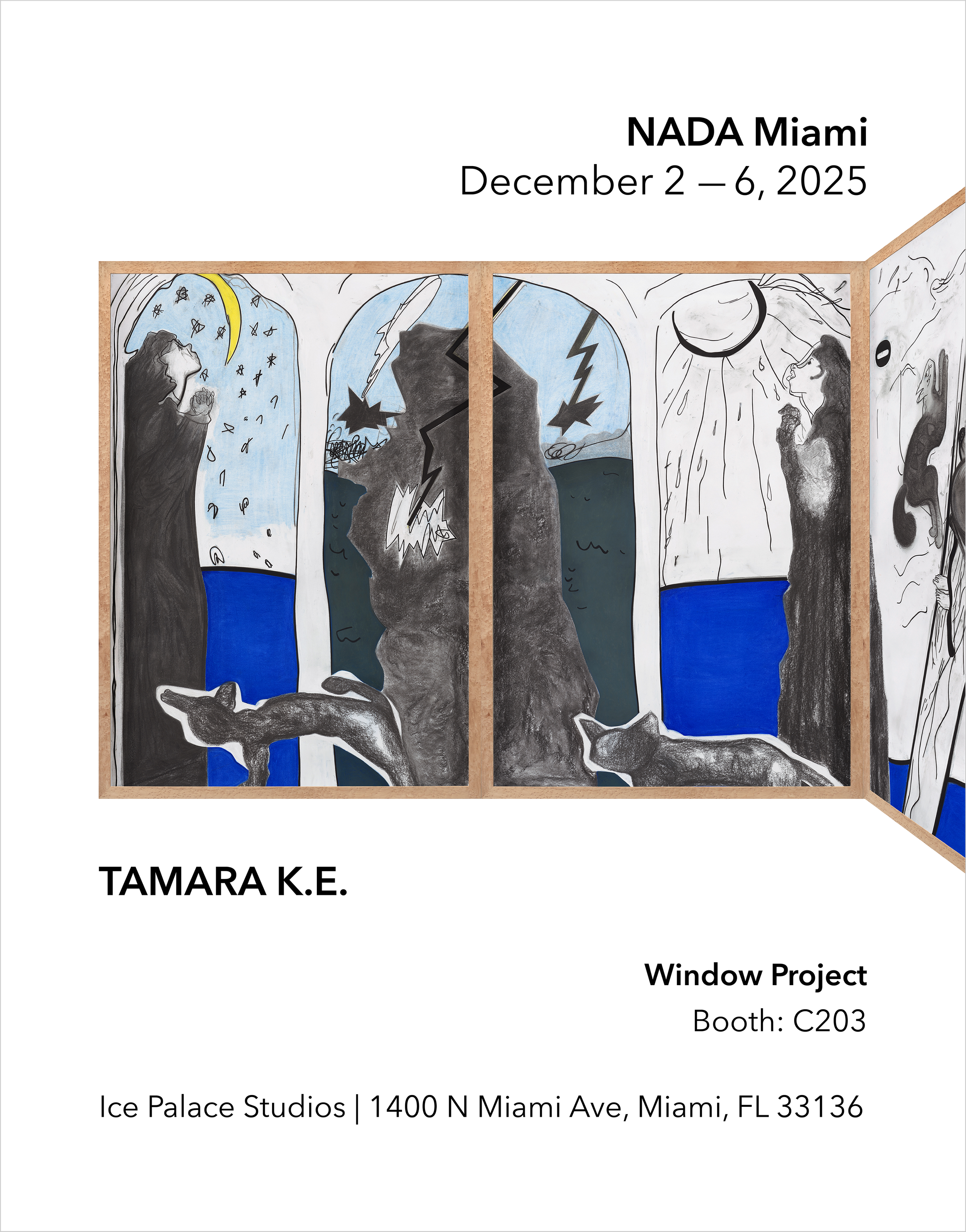 For NADA Miami 2025, Window Project is pleased to present a solo booth by Tamara K.E., featuring mixed media works on paper from her ongoing series Revisiting Fear (2014-), as well as a painting from the series Cool Girls Die Twice (2025), alongside a large-scale charcoal triptych titled Profound Tale and A Short Résumé (2025) from the series Remnants of the Glaring Day (2022-).
